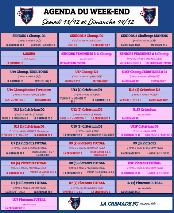 Ci joint l'AGENDA FOOTBALLISTIQUE du 13/14 DECEMBRE 2025