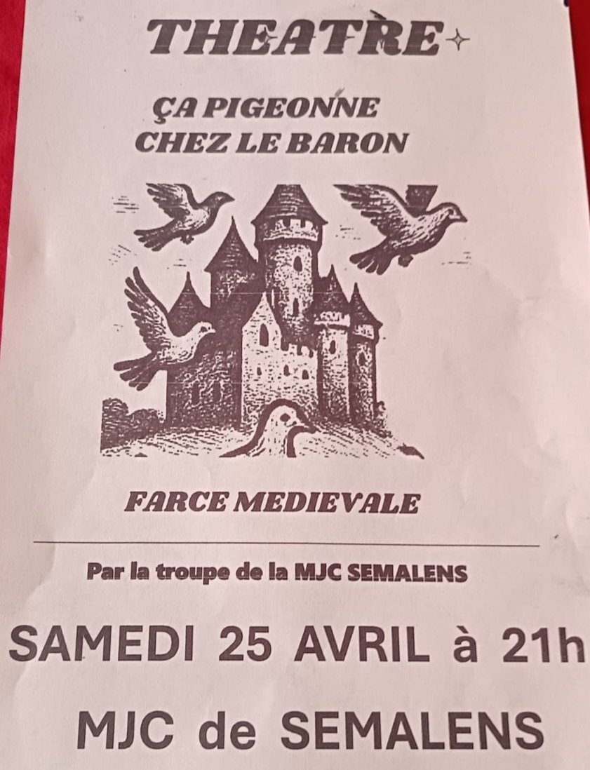 Programmation le samedi 25 avril 2026 à 21 h de la pièce de théâtre "CA PIGEONNE CHEZ LE BARON", farce médiévale en trois actes de Pascal Gérault, présentée par la troupe de la MJC de Sémalens.