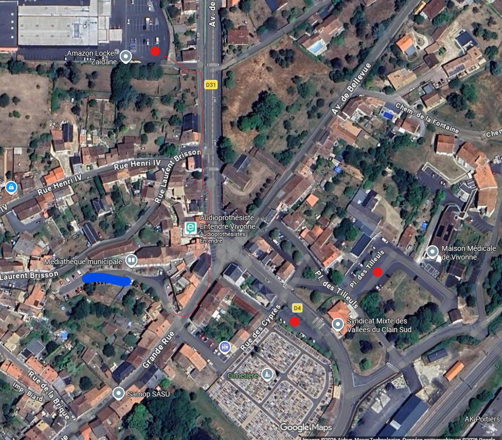 Les parkings alentours sont situés : Place Abbé-Hilaire-Baudouin, Place des Tilleuls et Parking super u (au niveau du drive). voir plan