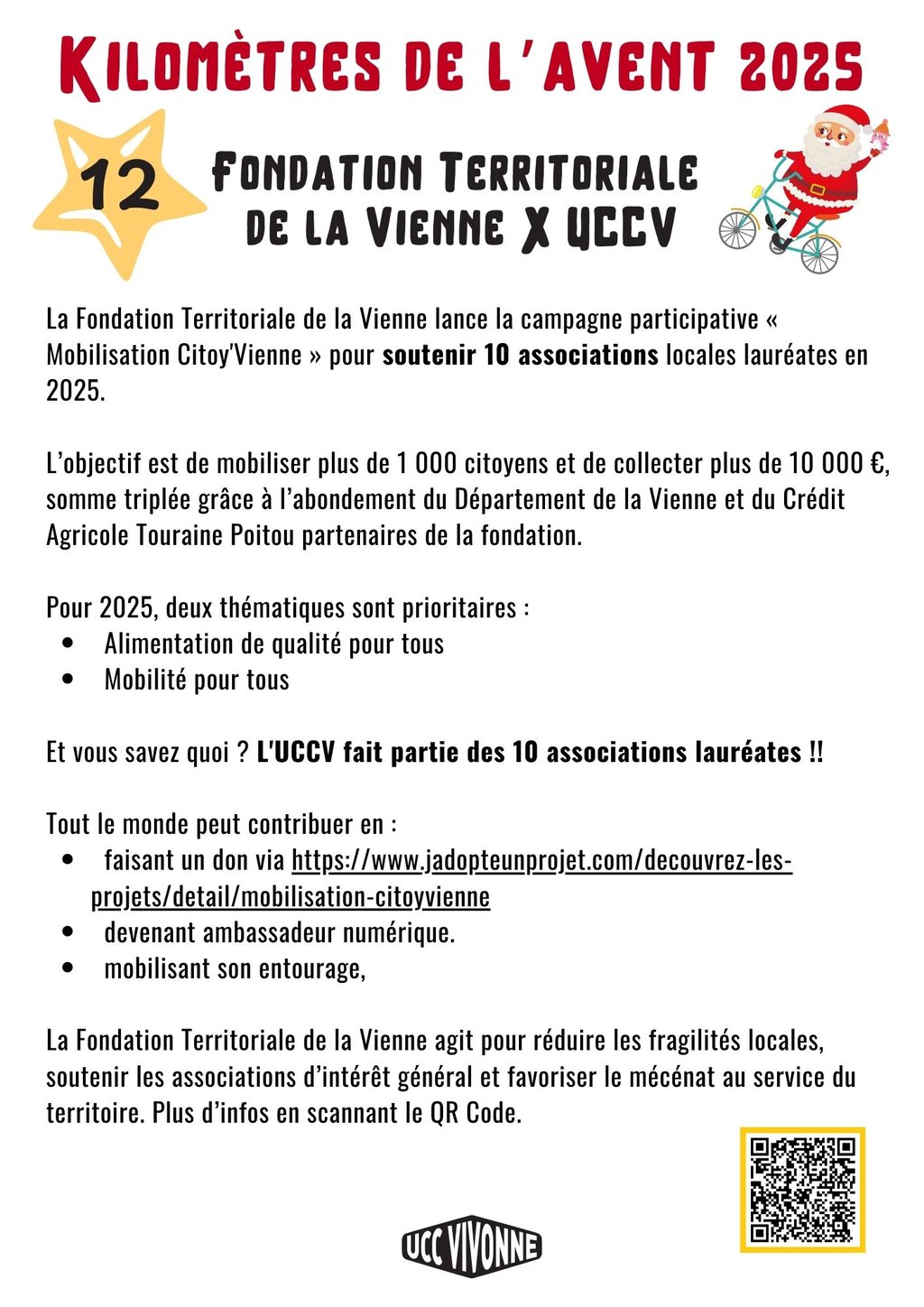 Partagez vos avancées avec le tag #KilometresAventUCCV2025 sur le réseau de votre choix (ou directement à contact@uccv.fr).