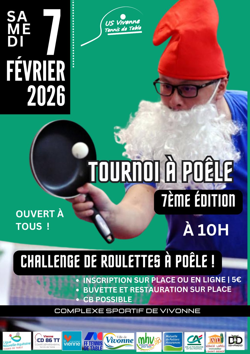 Tous à Poêles pour le 7ème « tournoi à poêle » du club de tennis de table de Vivonne le Samedi 7 Février, à partir de 10h au Complexe Sportif de Vivonne.