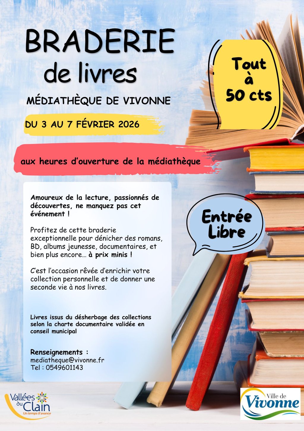 La médiathèque de Vivonne organise une braderie de livres du mardi 3 au samedi 7 février aux horaires d'ouverture de la médiathèque.