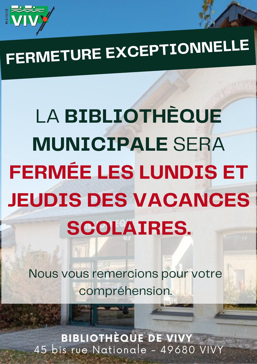 Nous vous informons que la bibliothรจque municipale sera fermรฉe les lundis et les jeudis pendant les vacances scolaires โ ๏ธ