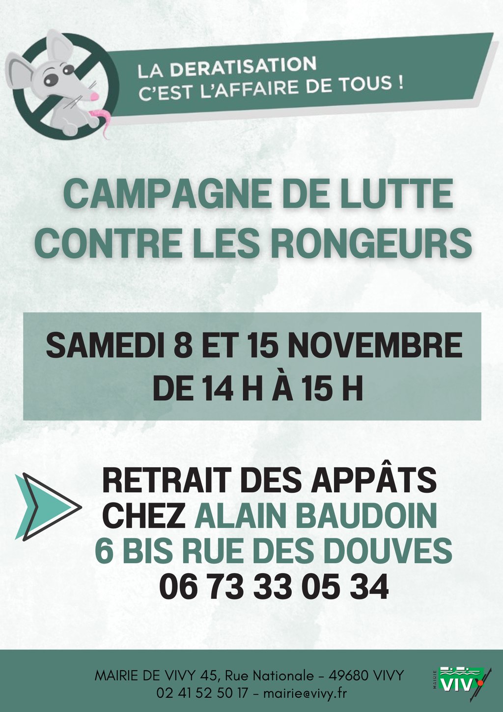 Dans le cadre de la campagne de lutte contre les rongeurs, une distribution dโappรขts se dรฉroulera les ๐๐ฎ๐บ๐ฒ๐ฑ๐ถ๐ ๐ด ๐ฒ๐ ๐ญ๐ฑ ๐ป๐ผ๐๐ฒ๐บ๐ฏ๐ฟ๐ฒ ๐ฑ๐ฒ ๐ญ๐ฐ๐ต ๐ฎ ๐ญ๐ฑ๐ต chez Monsieur Alain BAUDOUIN [6 bis rue des Douves] ๐๐