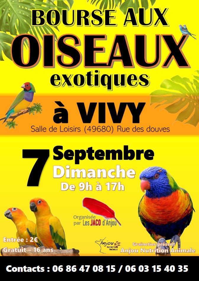 L'association les Jaco D'Anjou ou est fière de vous présenter sa Bourse aux oiseaux exotiques qui se déroulera dans la 𝘀𝗮𝗹𝗹𝗲 𝗱𝗲 𝗹𝗼𝗶𝘀𝗶𝗿𝘀 𝗱𝗲𝘀 𝗕𝗮𝘀𝘀𝗮𝘂𝗴𝗲𝘀 le 𝗱𝗶𝗺𝗮𝗻𝗰𝗵𝗲 𝟳 𝘀𝗲𝗽𝘁𝗲𝗺𝗯𝗿𝗲 𝟮𝟬𝟮𝟱 𝗱𝗲 𝟵𝗵 𝗮 𝟭𝟳𝗵