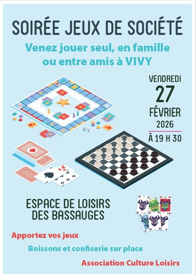 Venez jouer seul, en famille ou entre amis ! L'association Culture Loisirs vous invite à participer à sa soirée jeux de société le 𝘃𝗲𝗻𝗱𝗿𝗲𝗱𝗶 𝟮𝟳 𝗳𝗲𝘃𝗿𝗶𝗲𝗿 𝗮 𝟭𝟵𝗵𝟯𝟬 à la salle de loisirs des Bassauges ! ♟️🧩