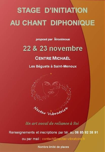 Durant ces deux jours, je vous propose de vous accompagner dans la découverte de vos « Sons de Pouvoir » et dans l'exploration de votre topographie sonore, afin que vous puissiez ainsi vous approprier votre Nectar Vibratoire, pour l’offrir... C’est ainsi que j’envisage le Chant Diphonique. Plus d'informations sur