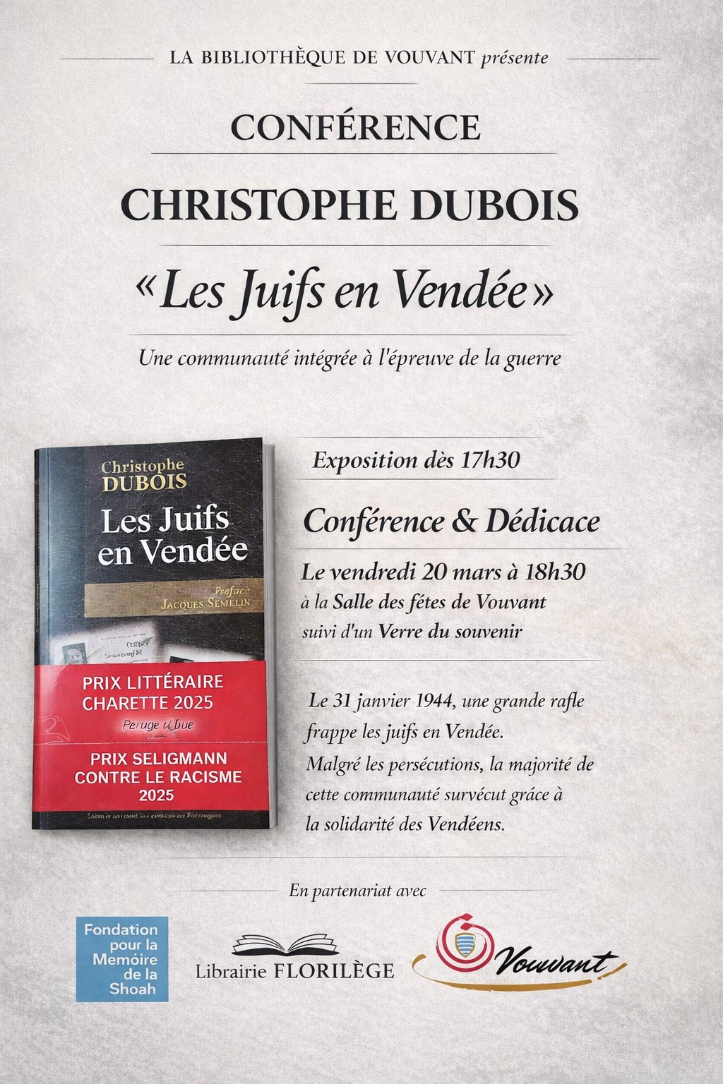 Nous avons le plaisir de vous annoncer que notre bibliothèque organise le 20 mars à 18 h 30 une conférence de Christophe Dubois sur le thème « Les Juifs en Vendée ». Un thème qui touche Vouvant de très près, des enfants Juifs ayant été cachés chez nous pendant la Seconde Guerre mondiale.