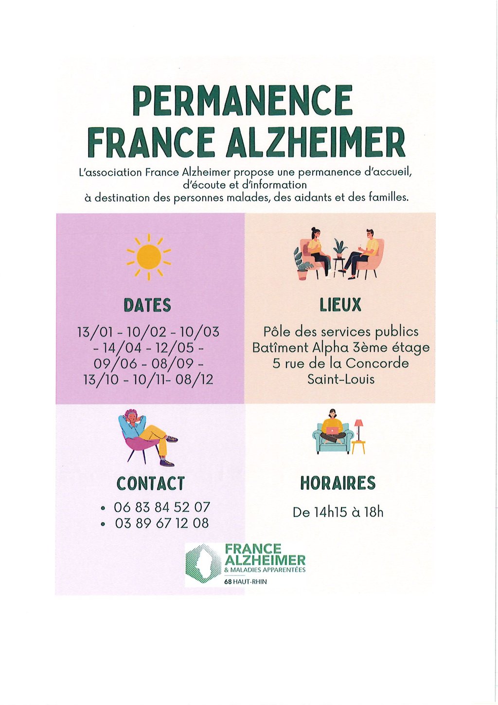 L'association France Alzheimer propose une permanence d'accueil d'écoute et d'information à destination des personnes malades, des aidants et des familles.