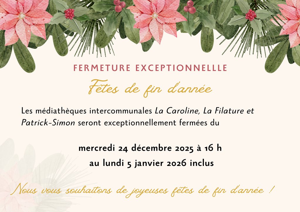 Les médiathèques intercommunales La Caroline, La Filature et Patrick-Simon seront exceptionnellement fermées du mercredi 24 décembre 2025 à 16 h au lundi 5 janvier 2026 inclus.
