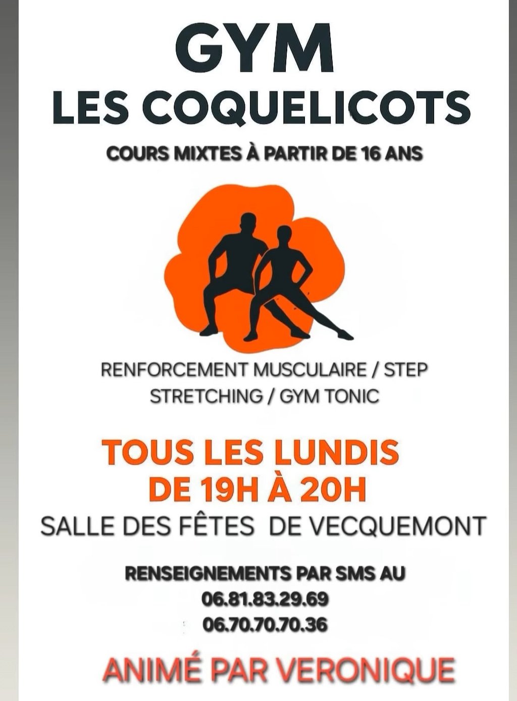 Tous les lundis de 19h à 20h à la salle des fêtes de Vecquemont. Renforcement musculaire, step, stretching, gym tonic..