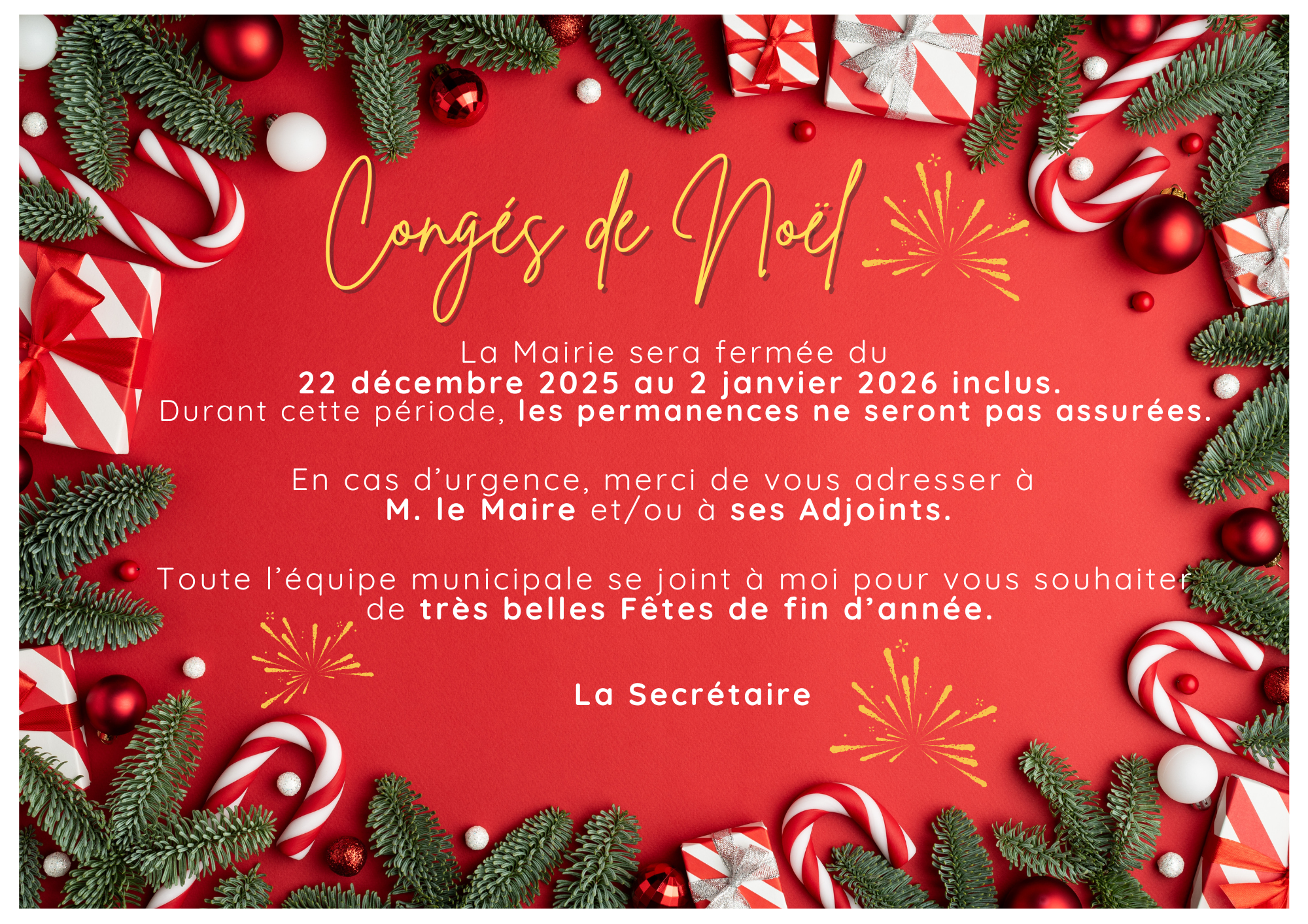 Fermeture de la Mairie du 22 décembre 2025 au 02 Janvier 2026 inclus.