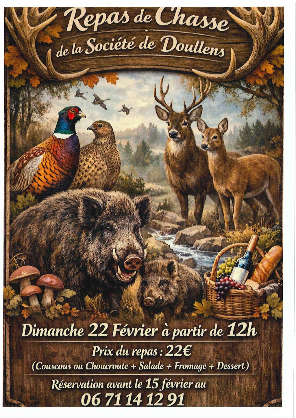 La Société de Chasse de Doullens vous propose un repas le dimanche 22 février à l'espace culturel, à partir de 12h.