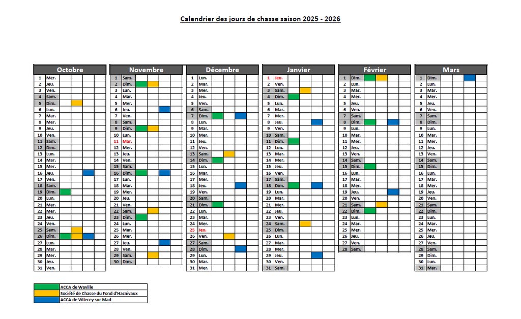 Retrouvez le calendrier des jours de battues pour la saison 2025 - 2026 de l'ACCA de Waville, l'ACCA de Villecey-sur-Mad, et de la Société de Chasse du Fond d'Hacnivaux.