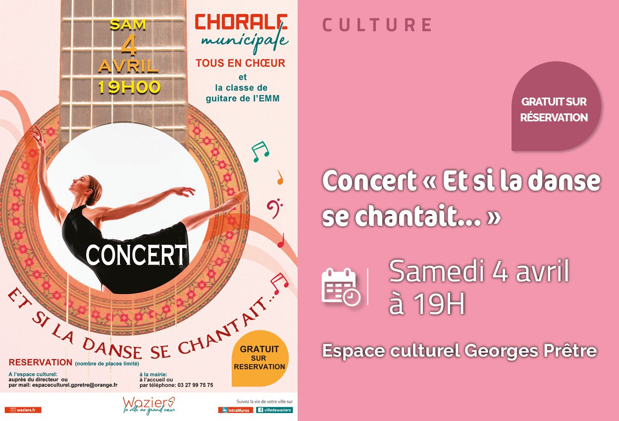 đ¶ La chorale municipale de Waziers et la classe de guitare de l'Ă©cole municipale de musique vous donne rendez-vous le samedi 4 avril 2026 Ă 19h Ă l'Espace culturel Georges PrĂȘtre pour son concert "Et si la danse se chantait..."