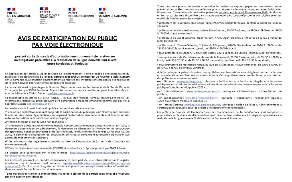 SNCF Réseau a déposé, le 1er mai 2025, auprès des services de la Préfecture de Région de Nouvelle-Aquitaine une demande d'autorisation environnementale relative aux études préalables aux travaux de la ligne à grande vitesse entre Bordeaux et Toulouse.