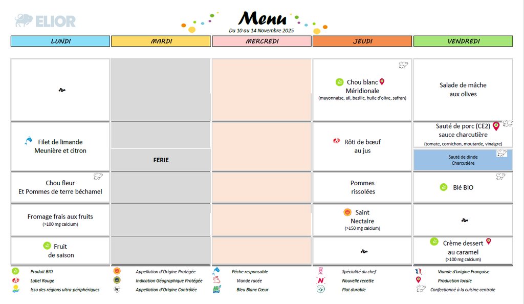Menu et allergènes de la semaine du 10 au 14 novembre