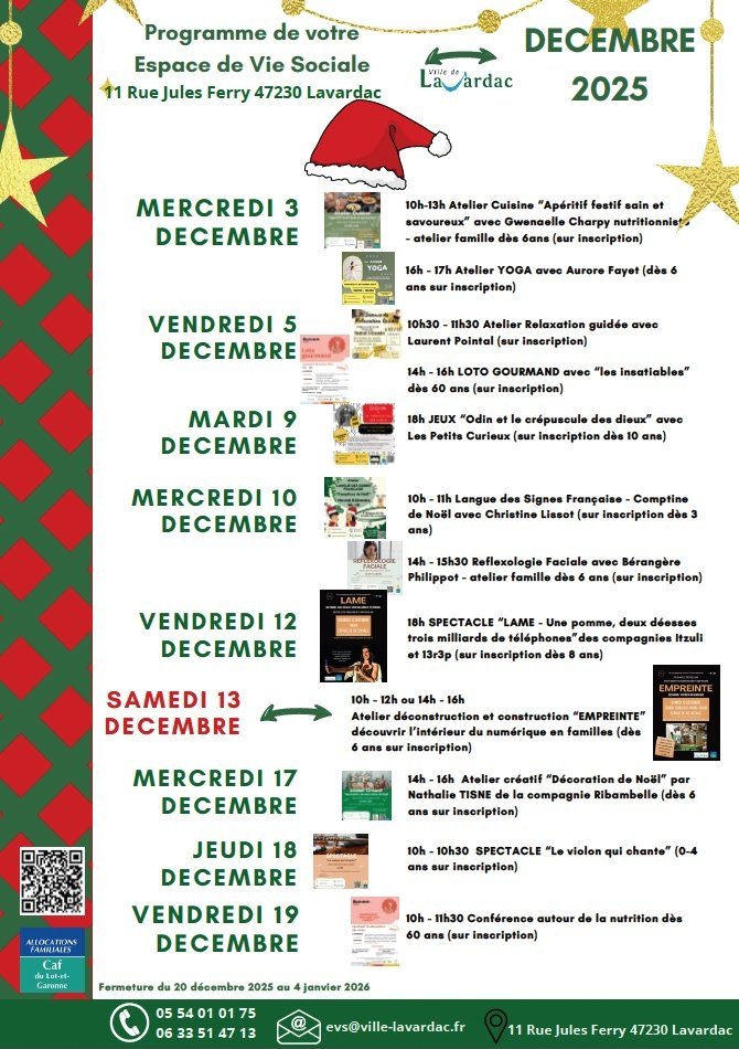 L'Espace de Vie Sociale de Lavardac vous transmet son programme pour le mois de décembre 2025.