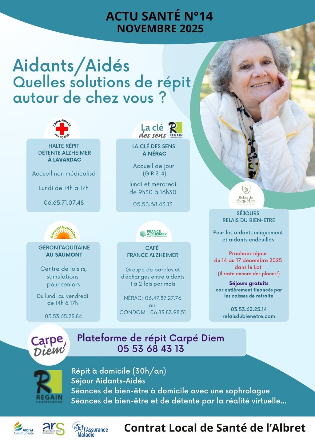 Dans le cadre du Contrat Local de Santé, voici l'Actu Santé du mois de novembre 2025 : Aidant / Aidés : Quelles solutions de répit autour de chez vous?