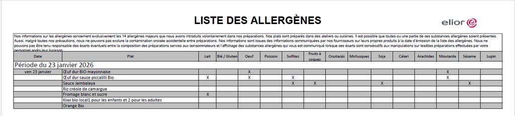 Suite à un essai d'un nouveau produit végétarien BIO sur le repas du 23 janvier 2026, les allergènes du 23/01/2026 modifiés sont sur la deuxième image après les menus.