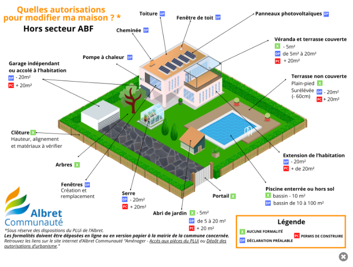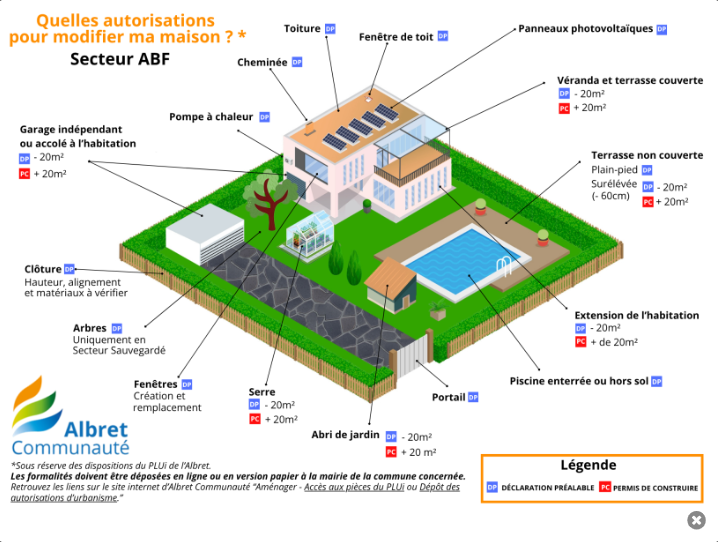 En fonction du type de projet et du lieu, il faut déposer soit une demande de permis (permis de construire, d'aménager, ...) soit une déclaration préalable de travaux.