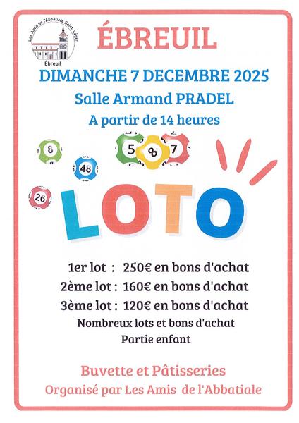 Les Amis de l'Abbatiale organisent un loto avec de nombreux lots et bons d'achat à gagner ! Partie enfant prévue. Buvette et pâtisseries sur place.