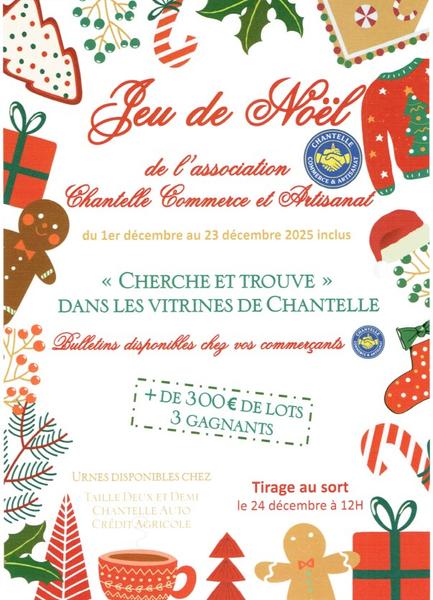 Jeu de Noël à Chantelle du 1er au 23 décembre ! Cherchez et trouvez dans les vitrines des commerçants pour gagner plus de 500€ de lots. Bulletins disponibles en magasin. Tirage au sort le 24 décembre à 12h. 3 gagnants. Bonne chance à tous !