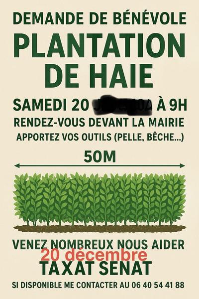 Participez à une action utile et conviviale ! Ensemble, plantons 50 m de haie pour embellir le village. Bonne humeur garantie : chaque paire de mains compte !