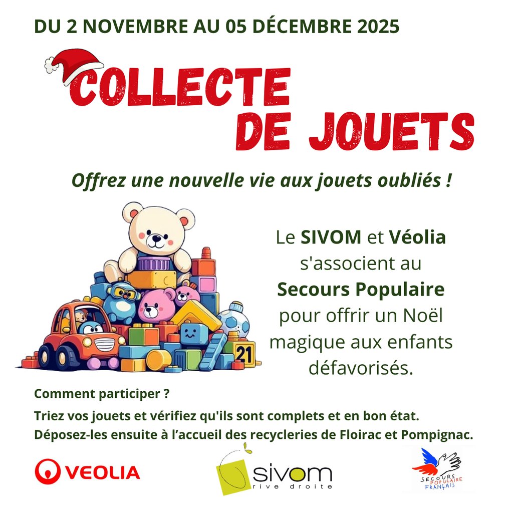 Du 2 novembre au 5 décembre 2025, le SIVOM Rive Droite et Veolia s'associent au Secours Populaire Français pour organiser une grande collecte de jouets.