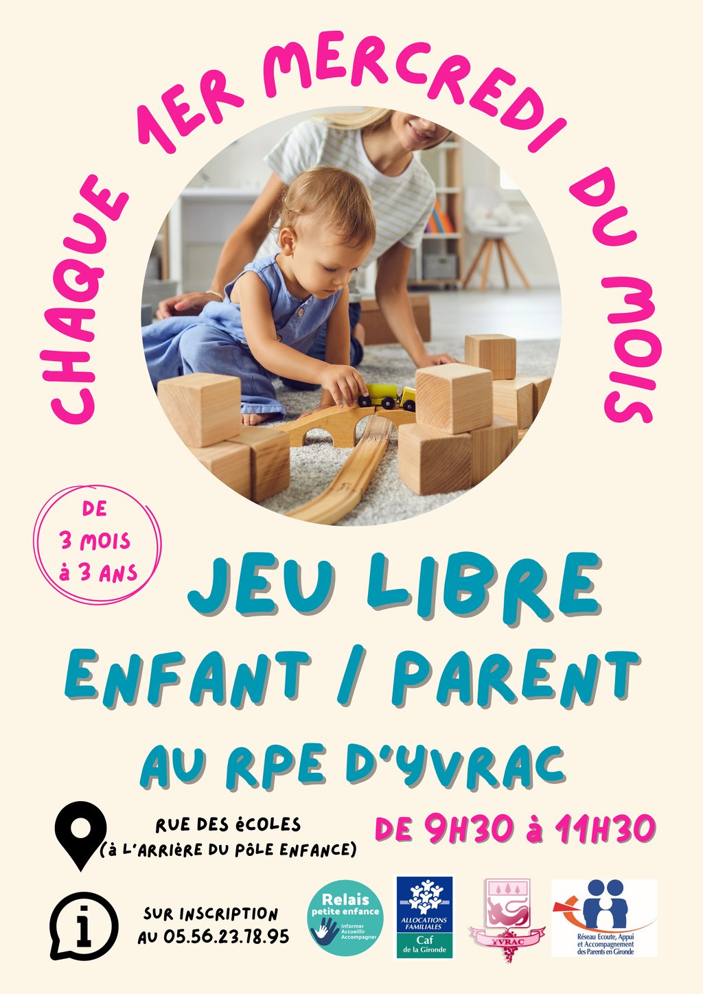 Matinée de jeu libre le 1er mercredi du mois de 9h30 à 11h30, pour les parents et leur(s) enfant(s) de 0 à 3 ans.