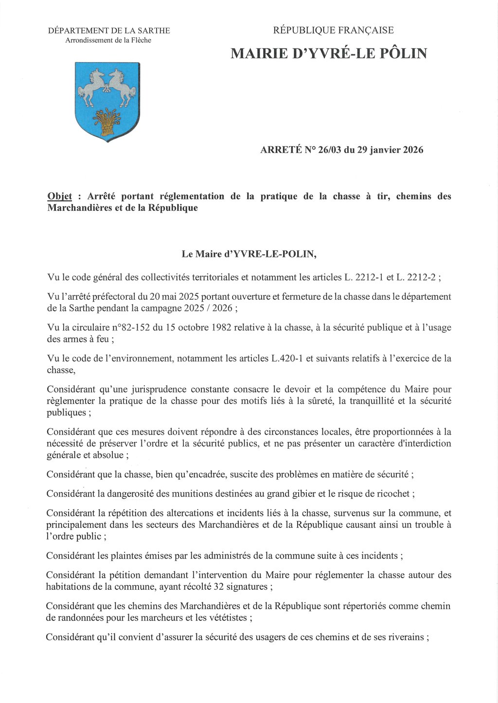 Un arrêté a été pris concernant l'utilisation interdite des armes à feux chemins de la république et des Marchandières le dimanche de 8h à 18h pendant toute la période d'ouverture de la chasse à savoir jusqu'au 28 février.
