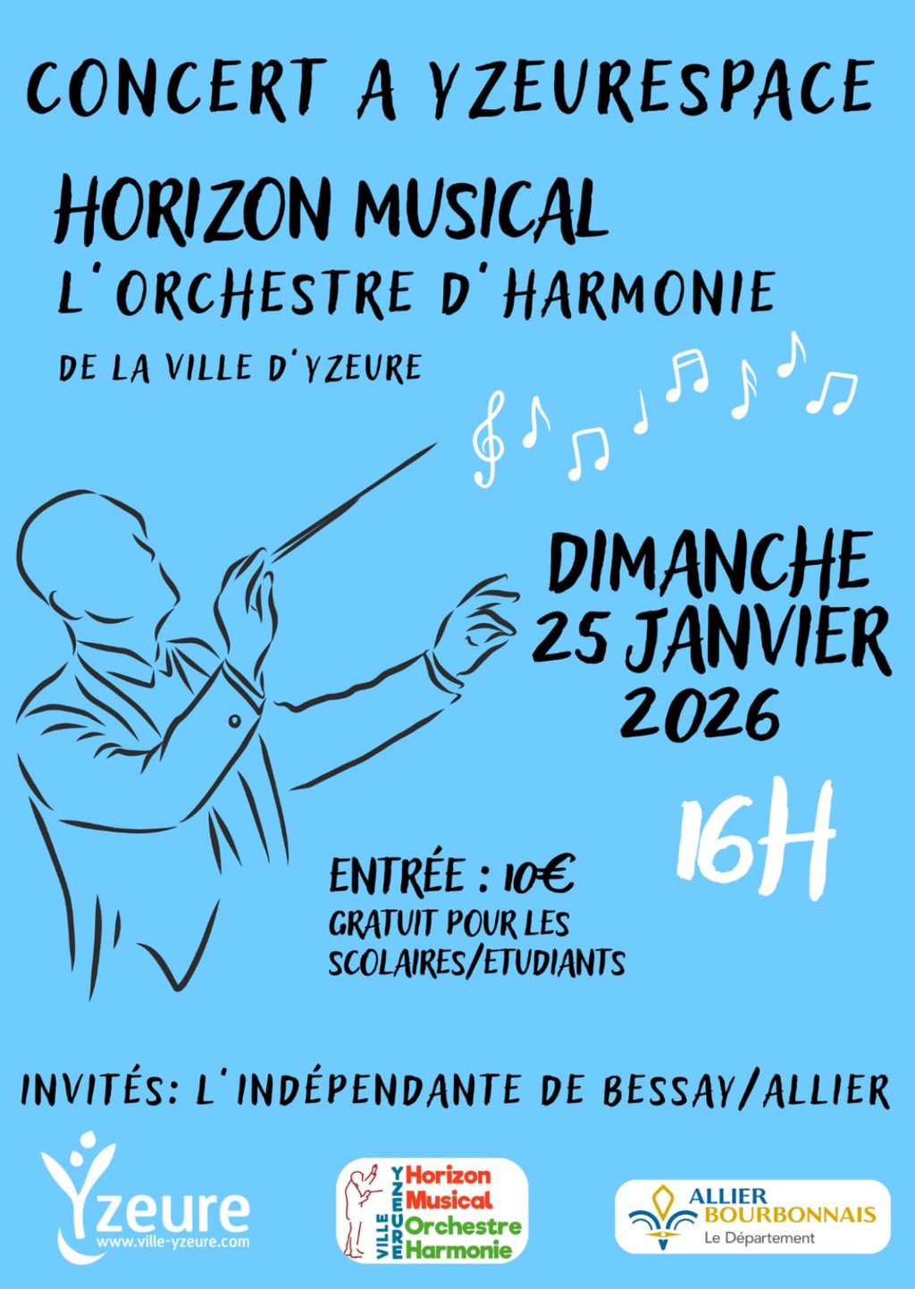 Horizon musical, l’orchestre d’harmonie de la ville d’Yzeure vous convie à son concert du Nouvel An le dimanche 25 janvier 2026 à 16h à Yzeuespace. L’orchestre invité sera l’indépendante de Bessay su Allier.